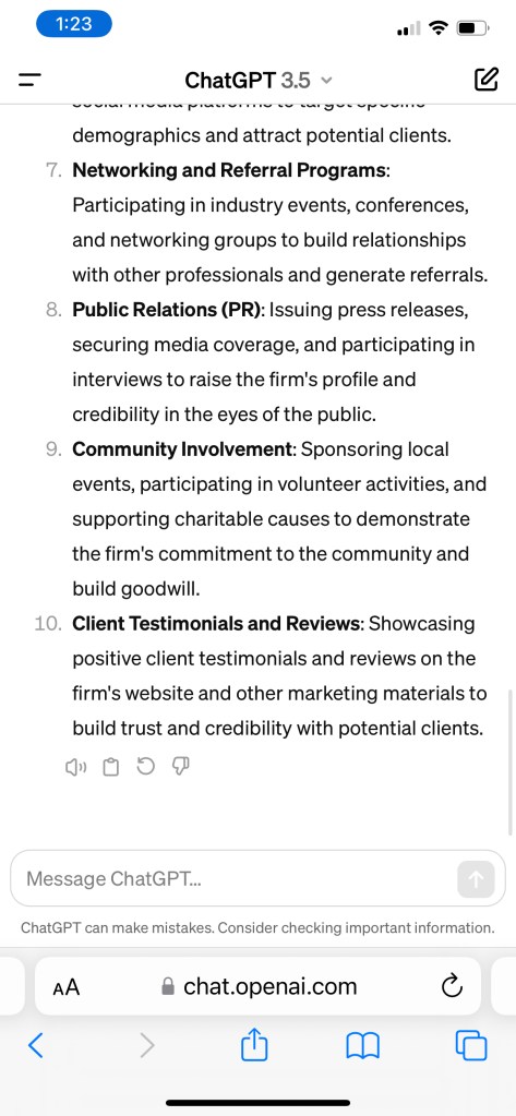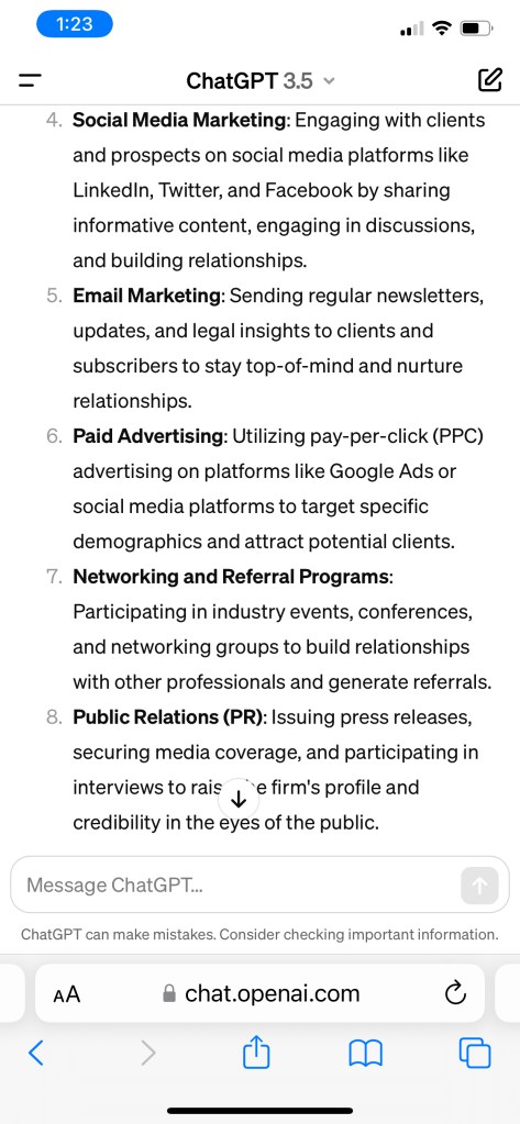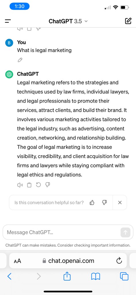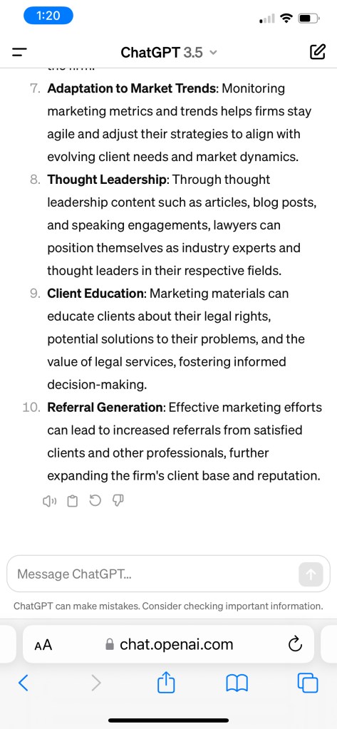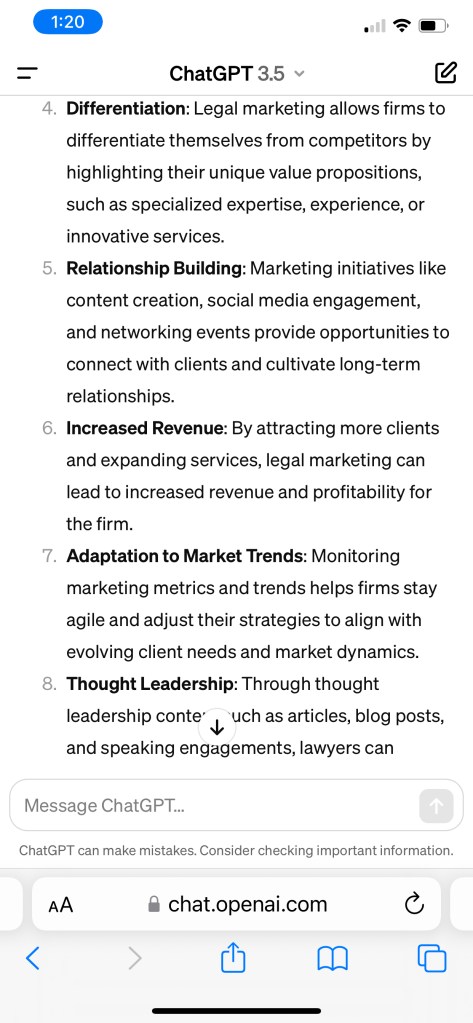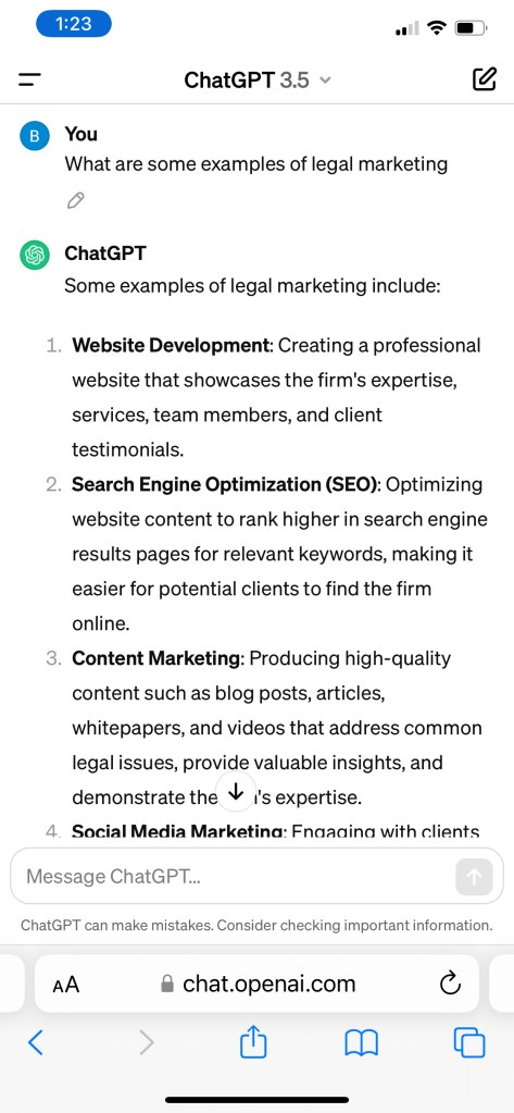 For the next three parts of this blog post, I’ll write about the benefits of legal marketing. I will share screenshots of Chat GPT’s responses and show how I would customize them.