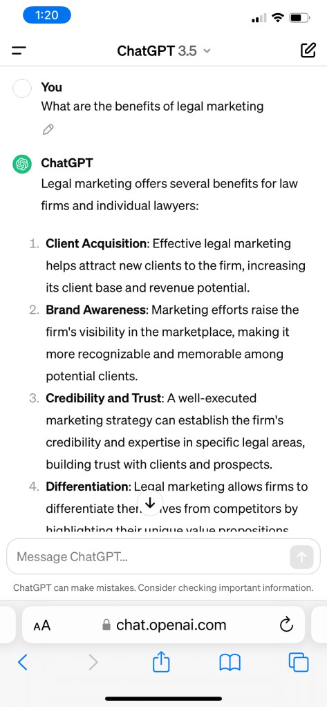 In this section, I will talk about the benefits of legal marketing. When I typed this question into Chat GPT, here is the response I received: